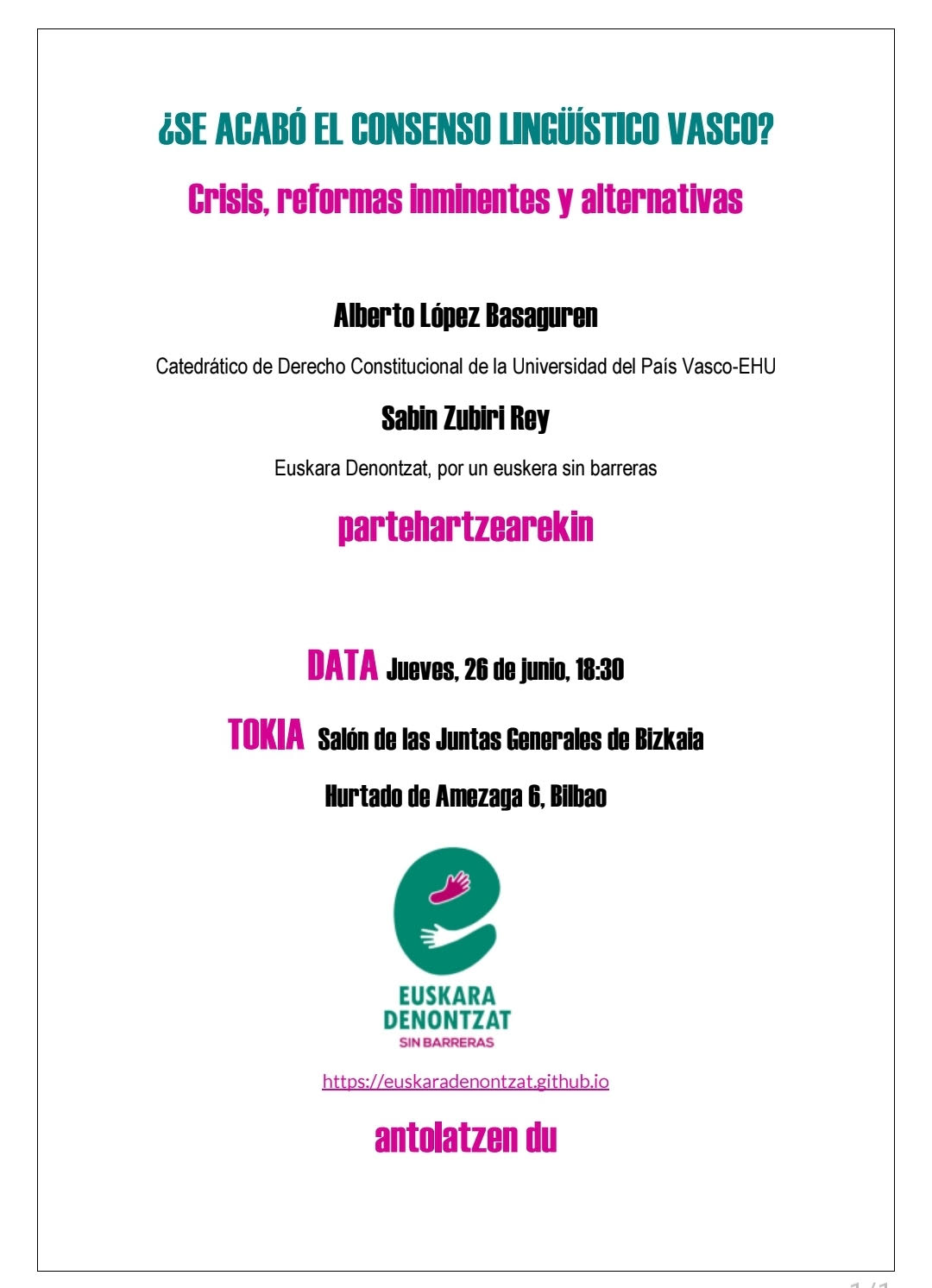 “Euskara denontzat, por un euskera sin barreras” es un grupo que quiere promover un debate propositivo sobre la política lingüística en Euskadi en clave pluralista, construyendo puentes para que el euskera sea accesible para toda la población y superando barreras. Se van a organizar distintas actividades de contraste y difusión.